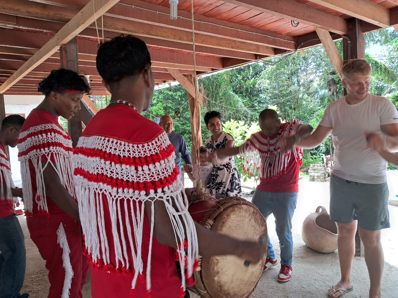 De ochtend begint rustig. Indien u wilt, maakt u een korte wandeling door het dorp of kiest u voor pool time: even drijven, kijken naar de bomen en luisteren naar de vogels. Rond 15:00 schuift u aan voor lunch (tot 16:00), waarna de middag overgaat in een levendige avond want tussen 17:00 en 19:00 barst de culturele avond los: eerst zang & dans (ongeveer een uur), daarna cassave bakken (nog een uur) met food tasting: u proeft het pittige peperwater (pepre watra) en de zachte Casiri. Als de schemer valt, verzamelt u zich bij het kampvuur. Daar luistert u naar storytelling over de Caraïben en Lokono; stel gerust uw vragen, er is tijd en ruimte om te delen.